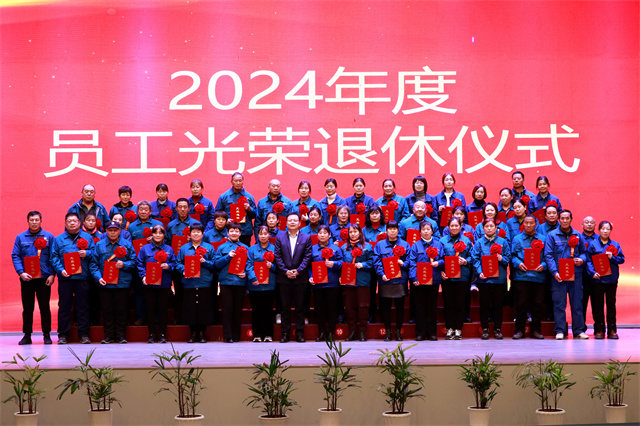 會上,為2024年度退休的員工舉辦了光榮退休儀式。公司黨委委員、紀(jì)委副書記、副總經(jīng)理孫玉濤宣讀了2024年度退休員工名單;黨委書記、董事長盛守祥為退休員工代表頒發(fā)榮譽證書;退休員工張炳營代表67位退休員工作退休感言。